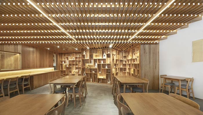 日式餐廳餐區(qū)設(shè)計(jì):餐區(qū)、吧臺(tái)、展示區(qū)構(gòu)成一個(gè)就餐區(qū)域,在這里客戶可以看到,農(nóng)作物是如何從源頭到做成熟食,這樣的過程讓客戶吃的更香,讓客戶感受到生活的美好。