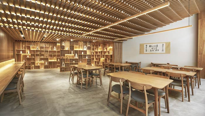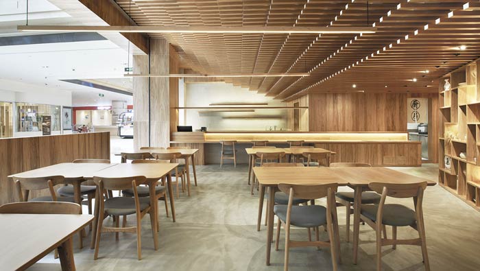 日式餐廳餐區(qū)設(shè)計(jì):從側(cè)角看整個(gè)空間呈不規(guī)則分布,客戶在就餐區(qū)可以清晰的看到每一個(gè)區(qū)域,這樣設(shè)計(jì)是為了讓客戶吃的放心、吃的安心。