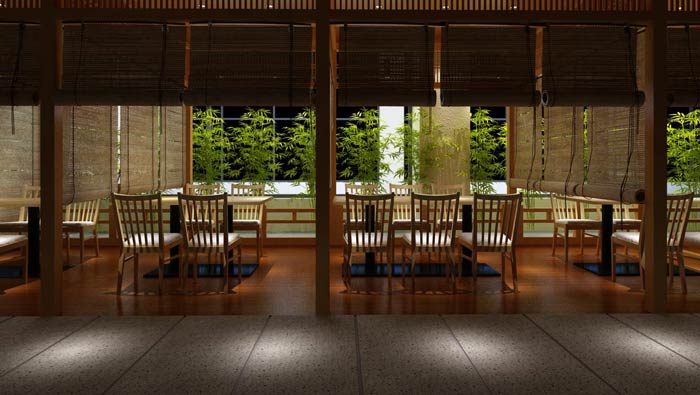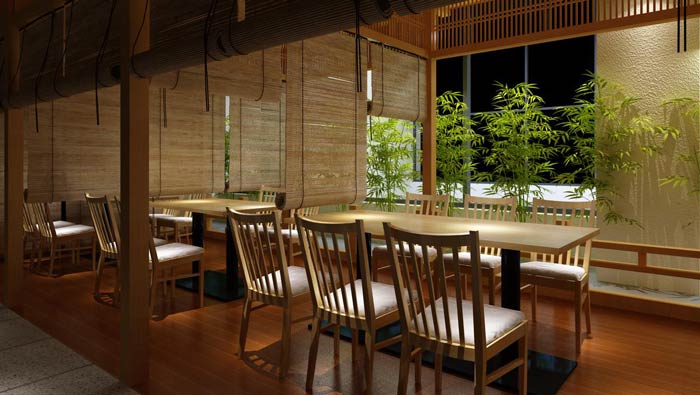 日本料理餐廳過道餐區(qū)設(shè)計(jì):竹子為空間帶來了一絲綠色,整個(gè)空間看起來郁郁蔥蔥,下雨天的時(shí)候,客戶在這里吃飯、聊天,看著室外的雨水,也是一個(gè)不錯(cuò)的享受。