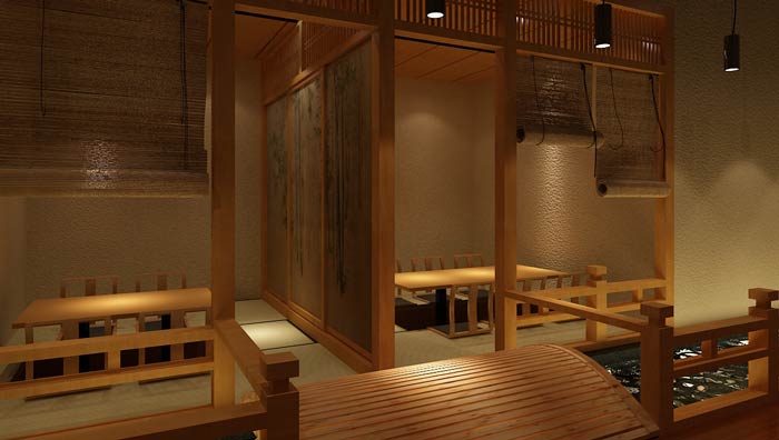 日本料理餐廳私人餐區(qū)設(shè)計(jì):這里供朋友、情侶、一家人在這里就餐,半封閉的設(shè)計(jì)保證了空間的隱秘性,也由于半封閉的設(shè)計(jì),讓客戶享受半封半開的就餐氛圍。