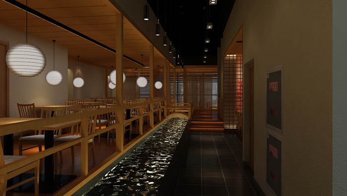 日本料理餐廳吧臺(tái)設(shè)計(jì):師傅把制作好的壽司,放在盤子后擺在運(yùn)輸帶上,運(yùn)輸帶圍繞餐廳的坐臺(tái)而行,顧客可隨意食用,用膳后,店員依照顧客桌上的盤子而結(jié)算帳單。