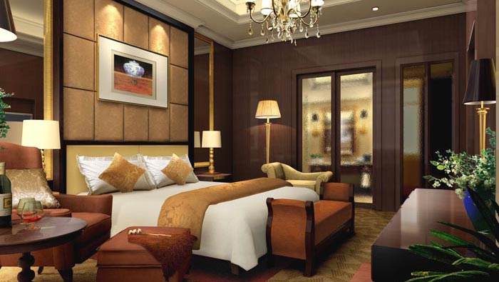 總統(tǒng)套房臥室的設(shè)計(jì):靜怡是此處給人的感覺,在這里給人的感覺不僅是安靜,而更多的是文化的熏陶,床邊的躺椅讓他們躺在那里看書,閱讀書籍是一種享受,在設(shè)計(jì)師看來(lái)書籍是連接古代先賢的重要媒介,在這里顧客的心可以完全安靜下來(lái),去體會(huì)心外無(wú)物的哲學(xué)問(wèn)題。