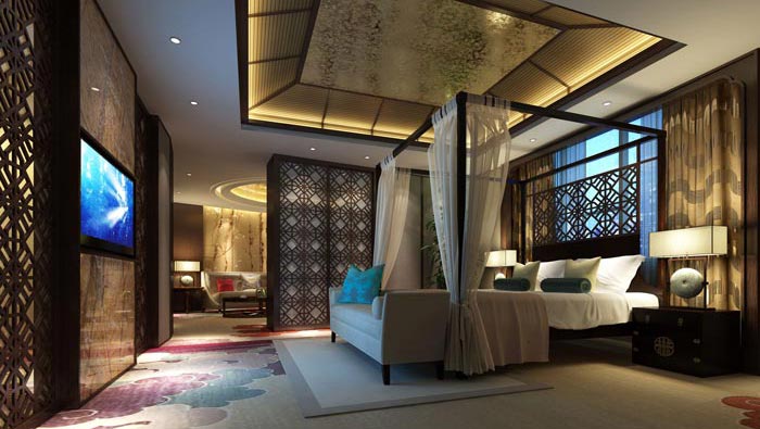 套房臥室的設(shè)計(jì):當(dāng)顧客進(jìn)入臥室之后,首先感受到的就是溫馨,這里結(jié)合了中式的設(shè)計(jì)風(fēng)格,在這里人的精神將進(jìn)入一個(gè)深層次的休眠當(dāng)中,這樣有利于精神得到更好的恢復(fù),當(dāng)客戶躺在床上之后,會感覺到月光透過窗戶照在臉龐之上,這感覺真是愜意,月光如少女的手拂過顧客的臉龐,讓人熟睡,撫平傷痕累累的內(nèi)心。