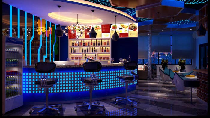 地面?zhèn)€性的地面拼花放射性的效果和吧臺(tái)融為一體,暗藍(lán)色的肌理漆,很好的鋪墊了大環(huán)境,木紋的裝飾個(gè)性爾舒適,設(shè)計(jì)的基本原則是少花錢(qián)出效果。