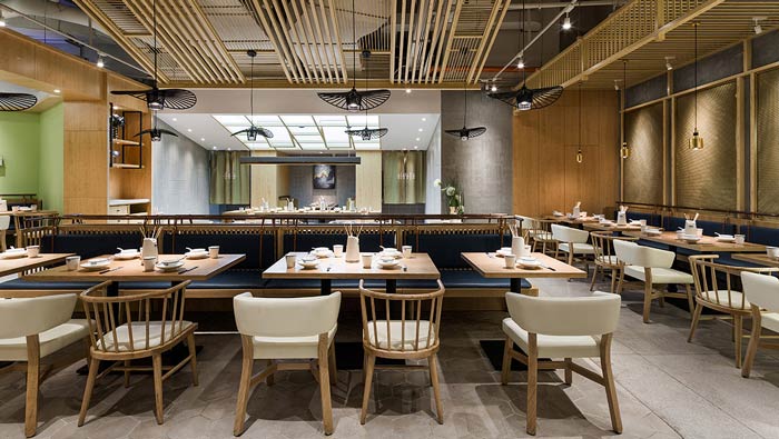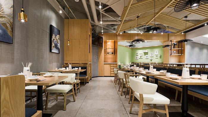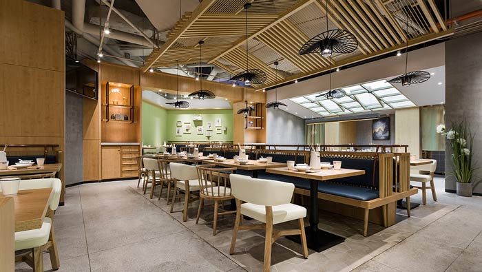 小吃店餐區(qū)裝修設(shè)計(jì):屋檐餐區(qū)設(shè)計(jì)有效的包容了中間餐區(qū),類似于丁字形的餐區(qū)設(shè)計(jì),是為了將空間打造的井然有序,一個(gè)有序的餐區(qū)設(shè)計(jì),相信會(huì)為餐廳的發(fā)展提供助力。