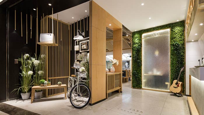 小吃店進(jìn)門區(qū)裝修設(shè)計(jì):盆栽為空間帶來(lái)了綠色,自行車為空間帶來(lái)了行動(dòng)力,吉他為空間帶來(lái)了音樂(lè)氣息,一切的一切都旨在改變?nèi)藗兊挠^念,讓客戶在這里享受傳統(tǒng)美食。