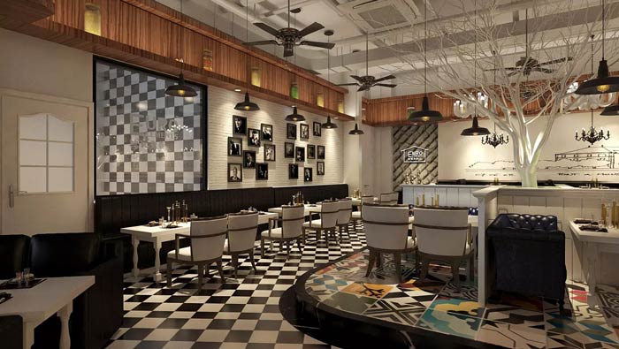 休閑西餐廳四人區(qū)裝修設(shè)計:逛商場很少一個人來,大部分都是三五成群,故此餐廳的餐區(qū),相對的向多人餐區(qū)傾斜,多人餐區(qū)滿足朋友之間的聊天、休息、就餐。