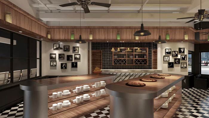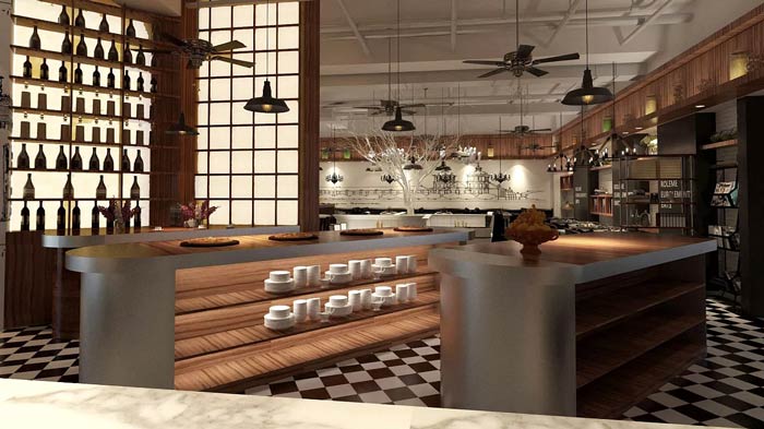 休閑西餐廳擺放區(qū)裝修設(shè)計:廚房的食物會先經(jīng)過這里,然后端到客戶面前,之所以這樣做是希望,從食品、服務員、餐具給客戶一種精致的感覺,讓客戶感受到吃飯也可如此精致。