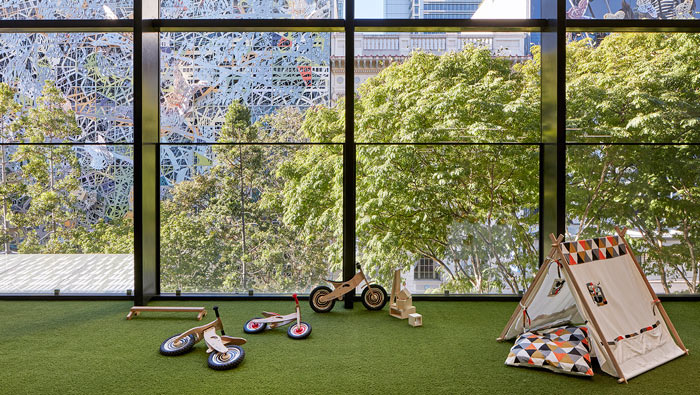 早教中心休息區(qū)設(shè)計(jì):孩子都愛(ài)赤腳走路,故此設(shè)計(jì)師在休息區(qū)的設(shè)計(jì)中,沒(méi)有設(shè)置座椅,只是將草坪安置在其中,孩子在其中赤腳坐在那里休息,帳篷讓孩子在自然中休息。