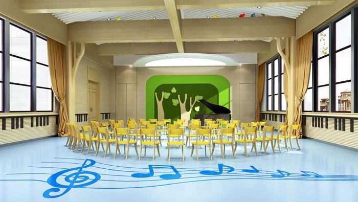 音樂教室的設(shè)計(jì):在這里孩子們仿佛進(jìn)入了音樂的世界,在這里孩子們可以翩翩起舞,音樂最是能夠打動(dòng)每個(gè)人,設(shè)計(jì)師希望孩子們?cè)谳d歌載舞之中,可以釋放自己的天性,讓音樂喚醒孩子們天真爛漫的個(gè)性,讓孩子們?cè)趯W(xué)習(xí)的過程中可以一直保持初心。