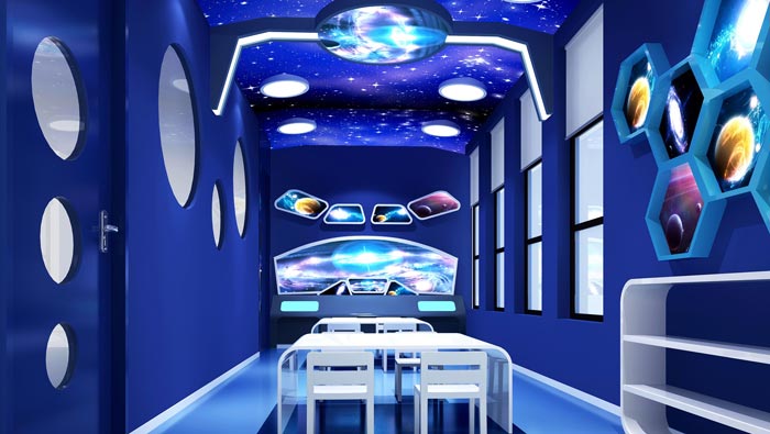 科幻教室的設(shè)計(jì):在這里孩子們可以體驗(yàn)太空的生活,這里完全都是仿真的設(shè)計(jì),在這里孩子們感覺自己好像在遨游太空,在這里高科技離我們是那么的近,讓孩子見證自己的未來世界,讓孩子對(duì)未來充滿期待、憧憬,在設(shè)計(jì)師看來教育本來就不能與世界脫軌。