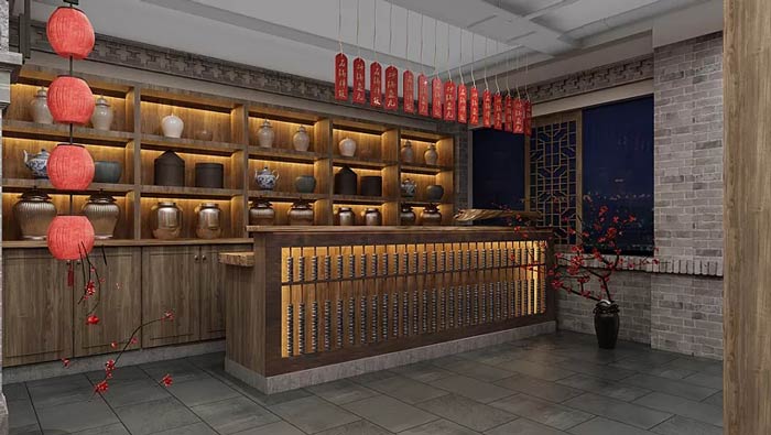 中餐廳中庭設(shè)計:客戶從這里進(jìn)入內(nèi)部空間,這里有石獅子、荷花、燈籠、大宅,各種不同的中式元素匯聚在這里,給人一種回家的感覺,在文化回歸的大環(huán)境下,這樣的氛圍更受人喜歡。