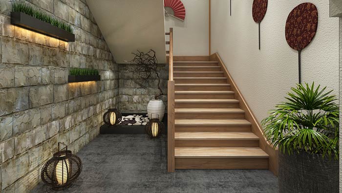 小型中式餐廳樓梯設(shè)計(jì):在樓梯的設(shè)計(jì)中,設(shè)計(jì)師著重強(qiáng)調(diào)的是踏步的間距與高度,目的就是希望保證上樓的安全,這樣的踏間距即安全又舒適,將危險(xiǎn)降至最低。