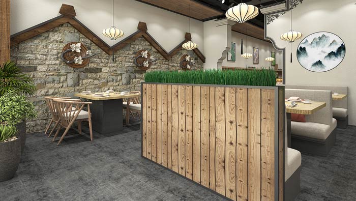 小型中式餐廳進(jìn)門區(qū)設(shè)計(jì):這里沒有高樓大廈,有的只是老建筑,客戶來到這里是尋求心靈的寧靜,在餐廳內(nèi)部的設(shè)計(jì)中設(shè)計(jì)師以寧靜為主線,讓客戶在這里收獲寧靜的心情。