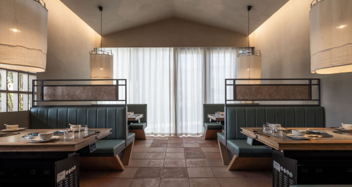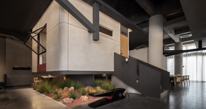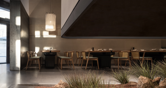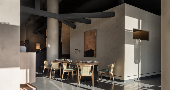 這是“侘寂煙火-如熹RUXI”餐廳的設(shè)計(jì)理念和品牌故事。餐廳以打邊爐為核心,強(qiáng)調(diào)“侘寂”美學(xué)的孤寂與市井煙火的對比。設(shè)計(jì)師通過將空間化零為整、打通室內(nèi)邊界,營造出人與自然之間的深層關(guān)系??臻g設(shè)計(jì)以“侘寂煙火”為主題,運(yùn)用開放界面和透明封閉界面,將自然光引入作為主要照明方式,創(chuàng)造出豐富的光影韻律。設(shè)計(jì)希望通過空間的沉浸感讓食客放松下來,享受當(dāng)下。整體空間設(shè)計(jì)質(zhì)樸自然,融入了水墨元素,增加了調(diào)性和趣味性。通過在“侘寂”中感受人間煙火氣,設(shè)計(jì)希望重新尋找通往松弛和諧的理想生活。