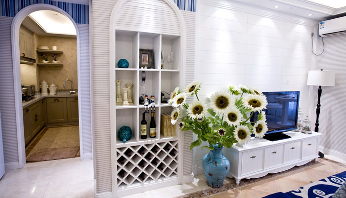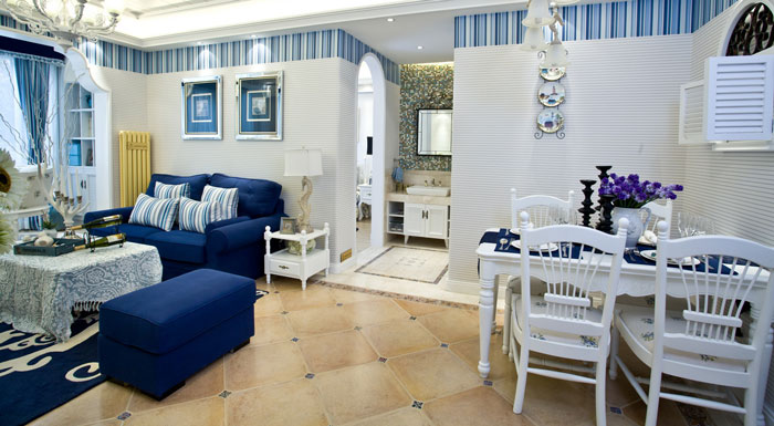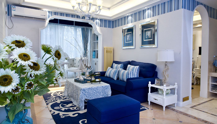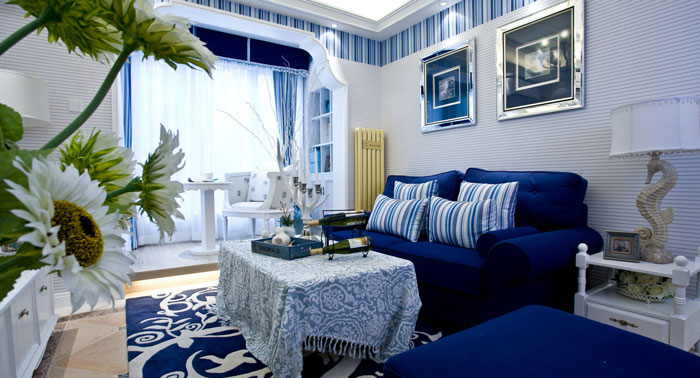 多以藍(lán)白色調(diào)為主,空間布置中加入海洋類(lèi)裝飾物件,如帆船貝殼之類(lèi),地中海風(fēng)格客廳中條紋沙發(fā)占有主要點(diǎn)綴作用。