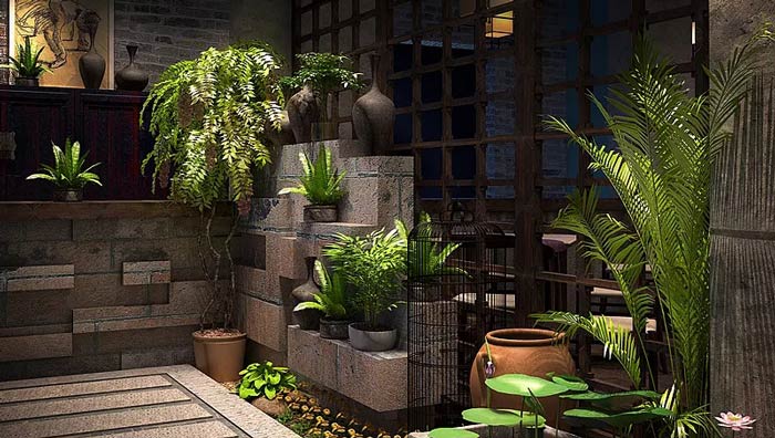 主題餐廳中庭設(shè)計:此處是連接室外與室內(nèi)的過渡區(qū)域,在這里客戶感受到的是自然、舒適,這也正是設(shè)計師希望看到的,設(shè)計師希望客戶對這里充滿期待。
