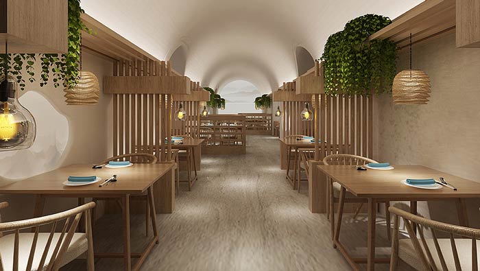 窯洞主題餐廳裝飾設(shè)計(jì):木制的餐桌、柔和的燈光、綠色的植物、弧形的屋頂,一切的一切感覺(jué)是那么的自然、和諧,讓人吃飯成為一種享受、美的享受。