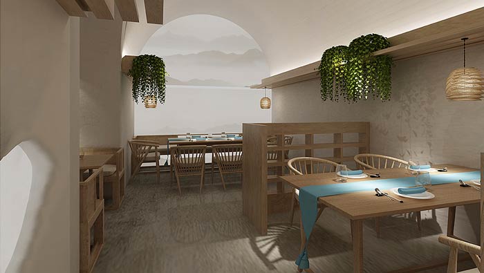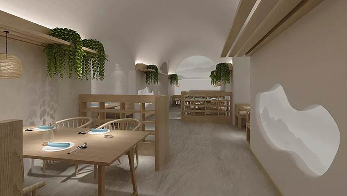 窯洞主題餐廳色彩設(shè)計(jì):整個(gè)空間有木色、綠色、自然之色三種顏色構(gòu)成,木色與綠色代表著原生態(tài),白色與周圍的自然風(fēng)景融為一體,讓人恍如夢(mèng)幻之中。