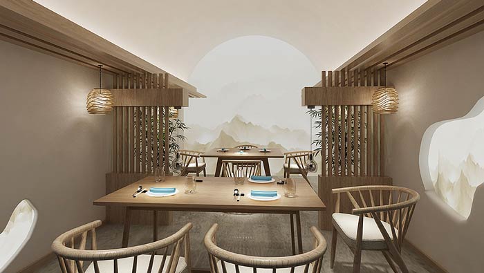 窯洞主題餐廳包房設(shè)計(jì):包廂內(nèi)部可以容納7-8個(gè)人,墻面上繪畫(huà)的山水、自然,讓人仿佛真的置身于自然之中,自然美景與中華文化完美的鑲嵌在整個(gè)空間之中。