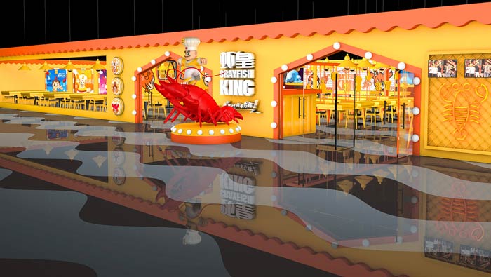 小龍蝦主題餐廳門頭設(shè)計:小龍蝦的標志幾乎無處不在,目的就是希望客戶,無論從哪方面都可以直觀的感受到空間的屬性,這是要打造無死角的運營基礎(chǔ)。