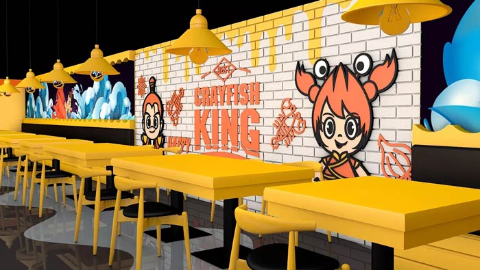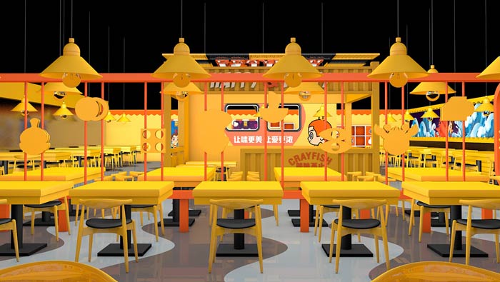 小龍蝦主題餐廳平面設(shè)計:所謂的平面設(shè)計,就是人平時看到的樣子,任何事物第一眼都十分重要,黃色的空間讓人難以忘懷,這就是設(shè)計師要做的設(shè)計營銷。