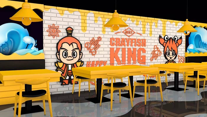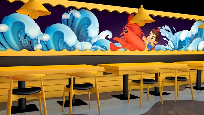 小龍蝦主題餐廳墻繪設(shè)計:整個空間的墻面都有其各自的特色,有的是為了一個故事,有的是為了一個品牌,有的是為了裝飾空間,墻繪的出現(xiàn)讓空間有了內(nèi)涵。