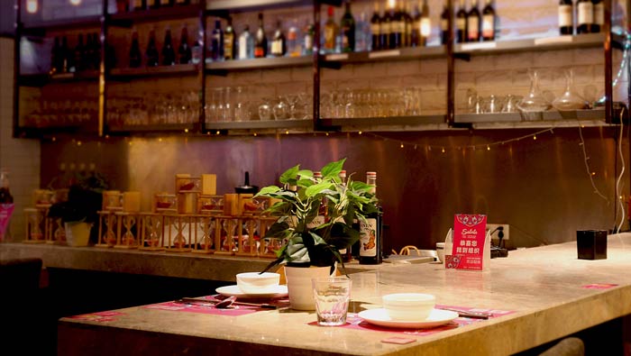 主題餐廳酒架設(shè)計(jì):酒架位于吧臺(tái)的內(nèi)部墻體之上,酒架的引入改變了空間單調(diào)的空間氛圍,在一定程度上讓空間更有活力,將空間變的活力十足。