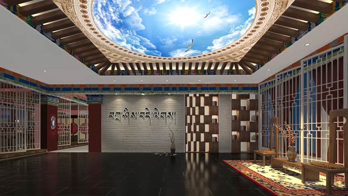 藏式主題餐廳進(jìn)門區(qū)設(shè)計(jì):設(shè)計(jì)師首先表達(dá)的就是藏族文化【文字】,其次表達(dá)的就是西藏的自然風(fēng)景,雄鷹在藍(lán)天自由的翱翔,以此展示豐富、燦爛的藏族文化。