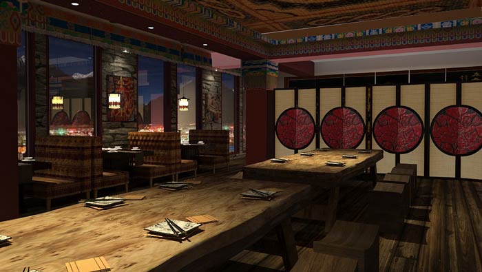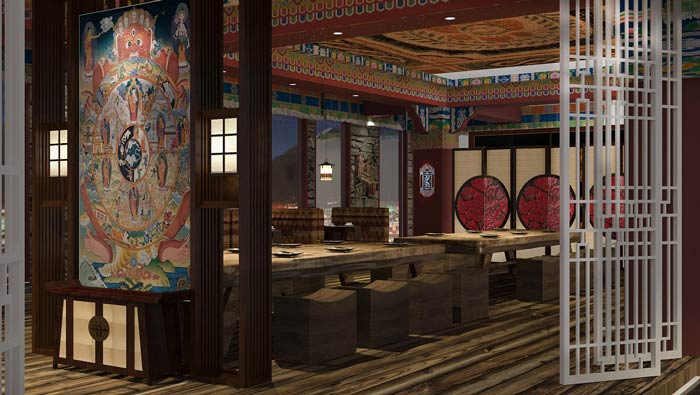 藏式主題餐廳就餐區(qū)設(shè)計(jì):在設(shè)計(jì)中設(shè)計(jì)師對(duì)藏式風(fēng)格進(jìn)行了調(diào)整,設(shè)計(jì)師希望將藏式風(fēng)格做的更加精簡(jiǎn),以此融入整個(gè)發(fā)展之中,這里表現(xiàn)的是藏族文化與現(xiàn)在文化的融合。