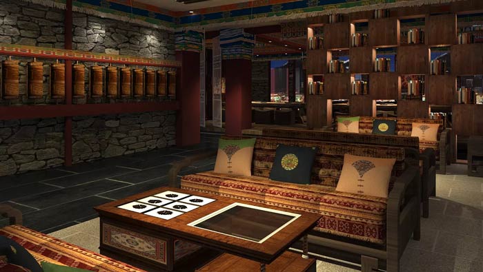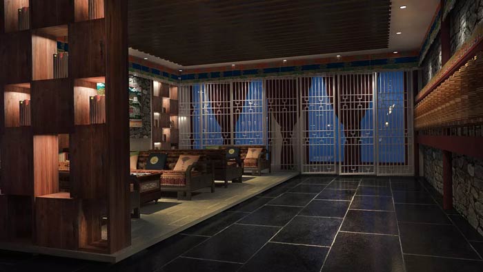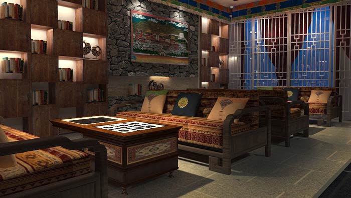 藏式主題餐廳等待區(qū)設(shè)計(jì):當(dāng)餐廳爆滿的時(shí)候,客戶將在這里等待,客戶可以在這里看看書、聊聊天,以此抵消等待的煩惱,這也是設(shè)計(jì)師希望看到的。