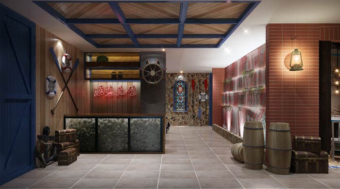 主題餐廳過道休息區(qū)設(shè)計(jì):逼真的海上場(chǎng)景布置,讓人仿佛回到了航海時(shí)期,仿佛徜徉在廣闊的大海中,實(shí)木桌椅的設(shè)計(jì),讓人感受到最原始的真實(shí)。