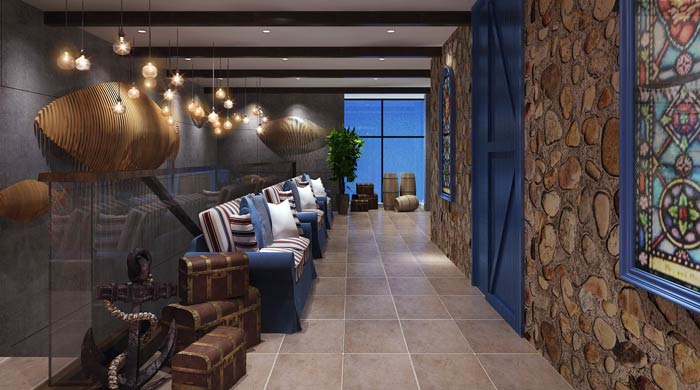 主題餐廳休息區(qū)設(shè)計(jì):當(dāng)下的社會(huì),很多人都厭倦了鋼筋水泥,這里設(shè)計(jì)師運(yùn)用逼真、復(fù)古、唯美的航海時(shí)期風(fēng)格,來緩解了人們對(duì)現(xiàn)代都市的厭倦。