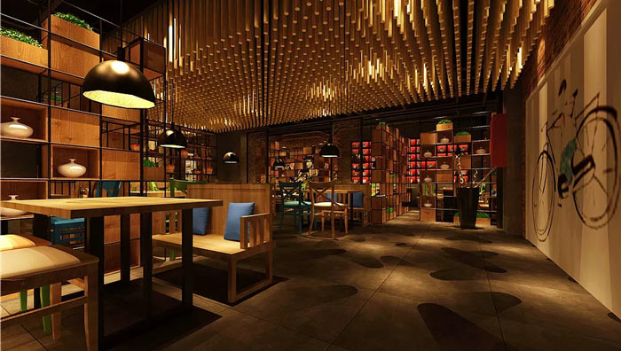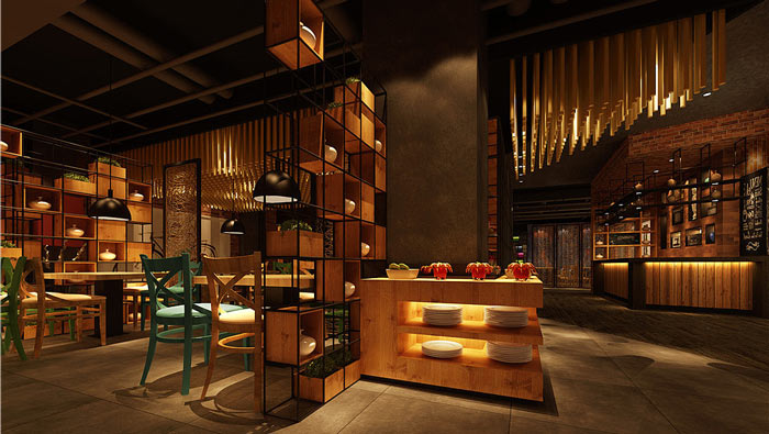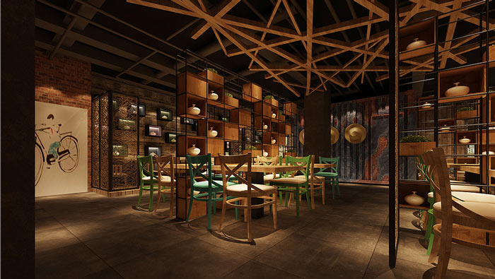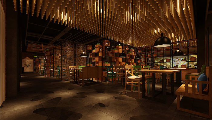 主題餐廳裝修設計:多根木條組成的天花吊頂極為壯觀,由不規(guī)則的木材特制的空間隔斷也極具新意,給人以強烈的視覺沖擊。
