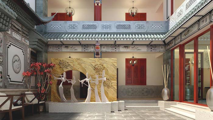 酒店進門區(qū)域的設(shè)計:此處在設(shè)計中融入了白族的文化內(nèi)涵,目的就是希望讓客戶感受到歷史的傳承,在現(xiàn)在人心浮躁的今天,設(shè)計師很希望讓大家可以靜下心來聆聽歷史,在歷史中尋找那難得的清靜,不管是瓦礫還是彈琴奏樂的場景,都讓人有種回到古時的感覺,讓人去體會那莊公夢蝶的體會。
