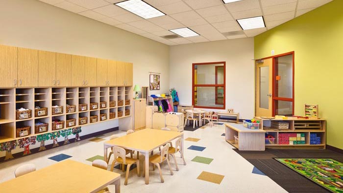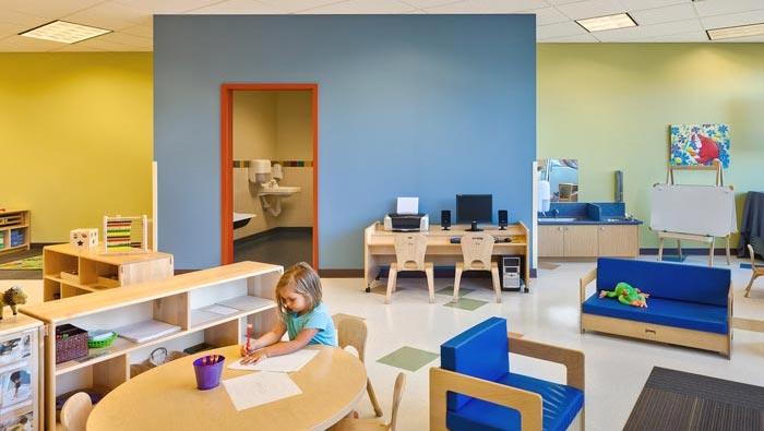 開放教室的設計:設計師在設計教室的時候,打破了早教中心一個教室只有幾個人的現狀,因為在設計師看來此時的孩子是玩多、學習少,故此人多才能讓孩子感到開心、快樂,人數少的話會造成孩子一定程度上的自閉,且對于孩子來說玩耍本身就是一種很好的學習,故此設計師打造了一個開放式教室,目的就是讓孩子在此處學習、玩耍。