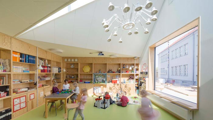 教室內(nèi)部的設(shè)計(jì):內(nèi)部有膠合板制成的“書柜墻”圍繞在空間的四周,與綠色地板一起構(gòu)成了整個(gè)空間的格局,這樣的設(shè)計(jì)為整個(gè)空間創(chuàng)造出,流暢的空間體驗(yàn)和一致性和透明度,讓孩子們?cè)谶@里成長(zhǎng)、在這里積累知識(shí)、在這里見證自己的童年。