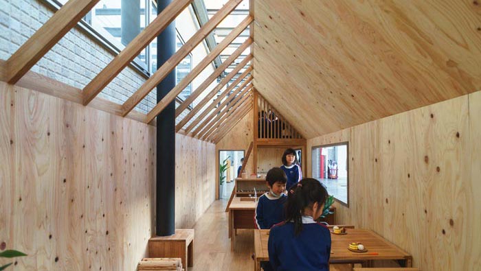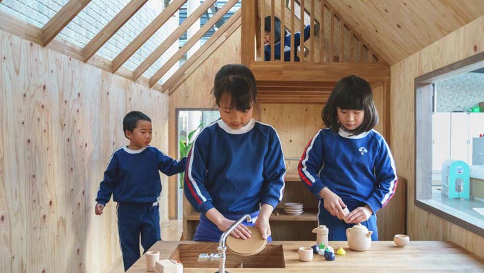 內(nèi)部空間的設(shè)計:從內(nèi)向外看可以看出整個空間條理十分清晰,目的就是不希望阻礙孩子的創(chuàng)造力和好奇心,在這里教會孩子不斷理清事物,有鮮花裝飾的桌子,用餐時讓孩子自己安排自己的菜肴,在飯后小孩子自己去洗碗,目的就是為了鍛煉他們動手的能力,讓孩子們在不斷學(xué)習(xí)中成長起來。